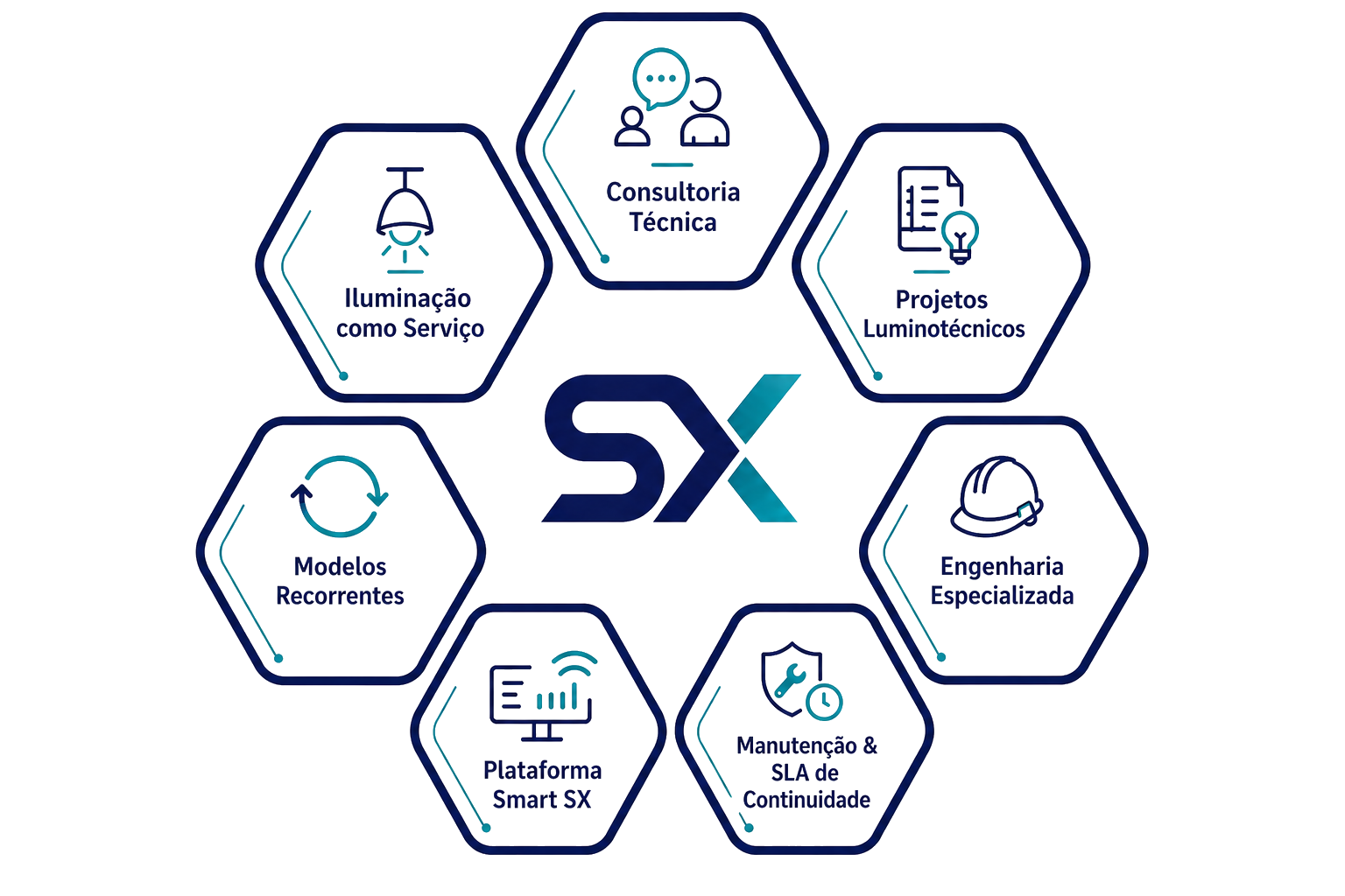 Um único responsável técnico do diagnóstico à operação. Você contrata resultado — economia, disponibilidade e conformidade — não apenas luminárias.